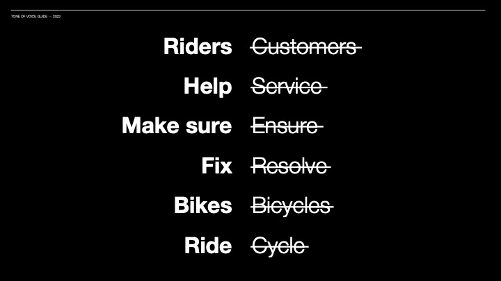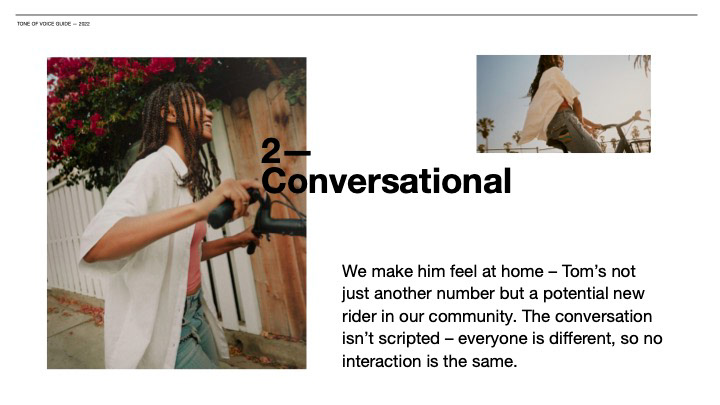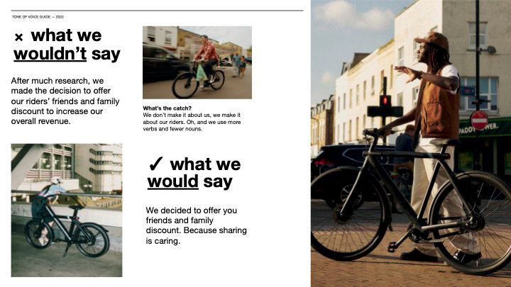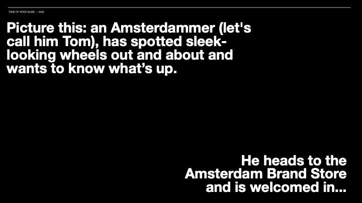 SOLUTION - Through talking at length to people across the entire business, deep-diving into the brand’s strategy and making sure to look forward (as well as back), I created a cohesive tone of voice guide from scratch for VanMoof. Once signed off, I then held tone of voice workshops for different departments across the business.